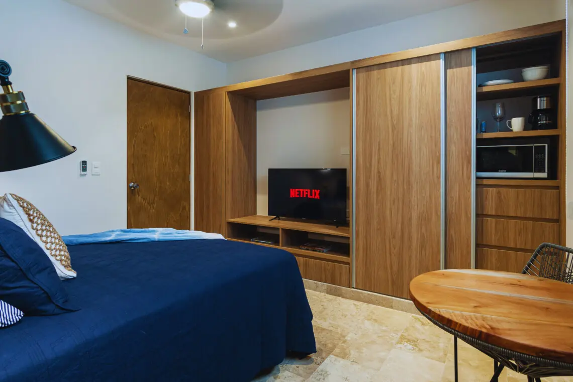 A stylish, private studio in the heart of Playa. Features a plush king bed, kitchenette, and spa-like bath. Enjoy Ipana’s luxury amenities, including rooftop pools and a gym, all just minutes from the beach and 5th Avenue.